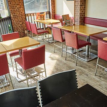 【テーブル席】2階には広々としたテーブル席を完備しており、少人数の飲み会から大人数での宴会まで対応可能です。ゆったりとした空間で、お食事や会話を心ゆくまでお楽しみいただけます。レンガ調のおしゃれな空間で、思い出に残るパーティーをお楽しみください!